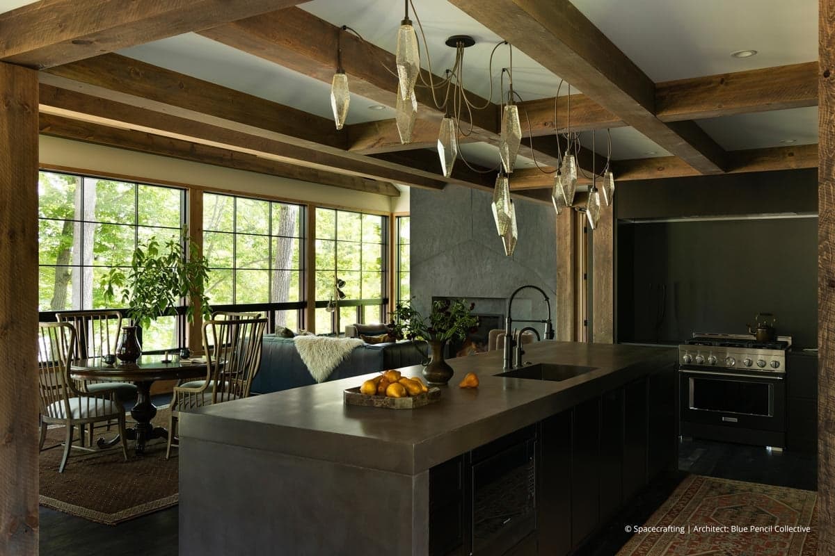 “We call it ‘A-typical Cabin’ because it has a raw, industrial feel versus a traditional, rustic cabin,” said Blue Pencil Collective’s Regan Nix. “The dark colors and natural materials give it a moody, cozy cabin feel with industrial moments and details.”