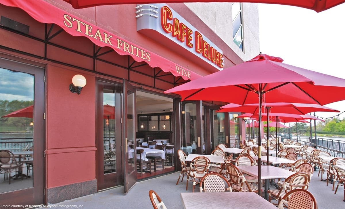 Café Deluxe in Gaithersburg, Maryland's Washingtonian Center opened last November to an eager clientele. The new Gaithersburg location features a large indoor/outdoor bar, a lakefront patio for 100 diners, and more doors and windows than any of the other properties. Kolbe provided Café Deluxe's numerous swinging doors, inswing casements and a 15-foot-wide folding window.