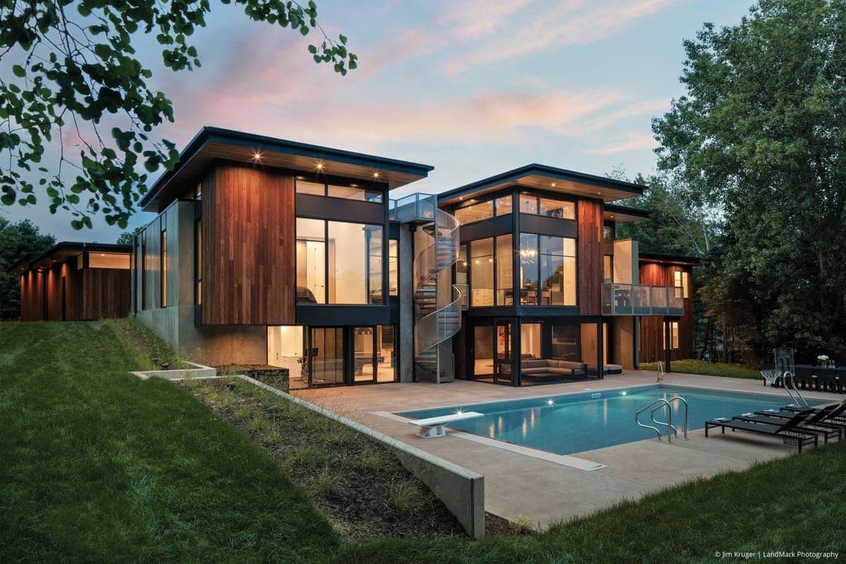 Set on a 6-acre wooded, lakeshore site in eastern Minnesota, “Cloud Forest House” draws its name from the homeowners’ travels to the cloud forests of Ecuador, more than 3000 miles away. Attracted to the property’s immersive natural surroundings, the owners moved into the existing house. After 10 years, they were ready to explore improvements to meet the needs of their active family of five. Their next priorities included expansive window views, a more spacious floorplan and an updated contemporary style.