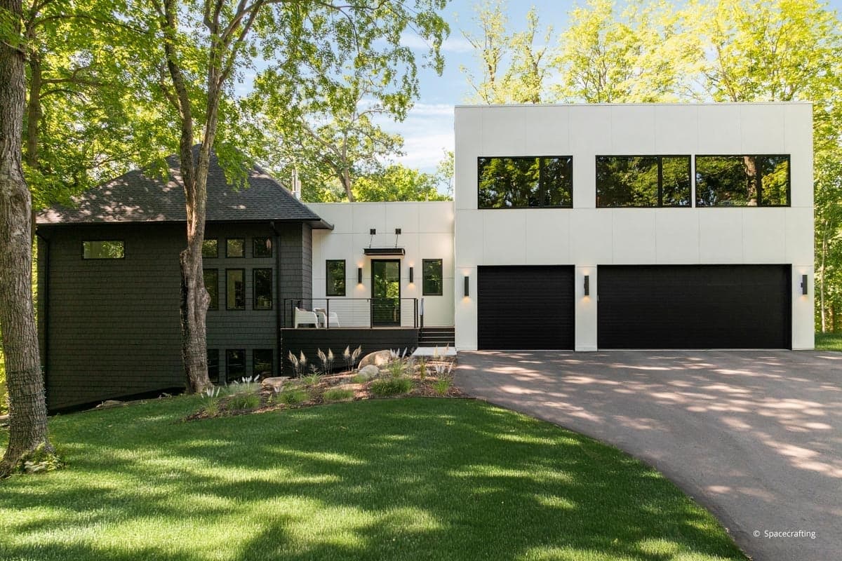 The decision guided the project forward. The integrity of the original house was maintained as a single-story cube topped with a pyramid-shaped roof. The existing garage was replaced by a newly built, larger cube with a flat roof. The old and new structures are connected by a low-profile link that serves as the main entry. Tommy elaborated, “We retained the cedar shake siding and stained it darker to get even more contrast with the smooth, white exterior siding which defines the new elements and addition.”