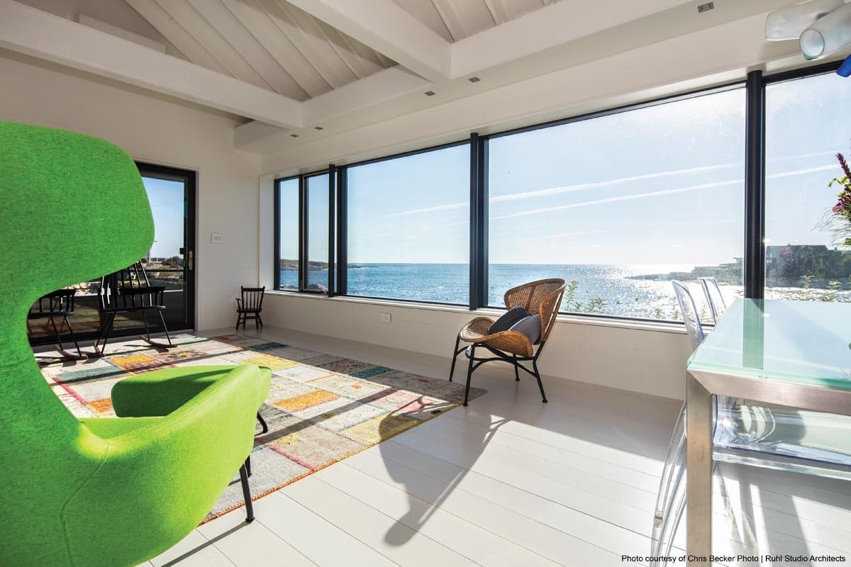 With respect to the coastal climate and fragile ecosystems, the modestly sized Gap Cove House was designed in close collaboration with the local Conservation Commission to exceed recently updated FEMA regulations. Ruhl describes, "We lifted the entire existing house above the flood plain level as determined by FEMA. In doing so, we're also more exposed to the wind coming off the ocean. On this (northeastern) side of the house, we specified laminated glazing for added protection. It's exciting to watch the windows work! Thankfully, there's no water or air coming through, and you are reassured that they're doing their jobs."